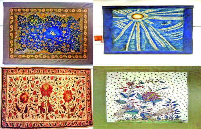 ગુલાબી પોતવાળા, મહેંદી બોર્ડરવાળા ચિત્રમાં કચ્છી છાયલમાં હોય એવું મોટું દૈત ફૂલ વિકસિત પાંદડીઓ વડે શોભે ! સાથે મોરલાની જોડે ટહુકા કરે ! ઇંડિગો ફ્રેઇમમાં હંસલાની જોડનો જળમાં સ્વૈરવિહાર, ભરચક કમળ, કમળકાકડી, કમળપર્ણ, કાંઠેણથી અને ટેકરી ઉપર વાઘ ફળફૂલ સાથે ઐક્ય સાધે ! ટાઇ-ડાઇ ટેકનિક સાથે જાપાનીઝ શિબોરી અને ઇન્ડોનેશિયન બાટીકને પડ ઉપર પડ મૂકી તૈયાર કરે. સાથે બાંધણીની બારીક કળા રજૂ કરે ત્યારે એ ઇંડિગો સિરિઝમાં આડી ઉભી મોતીની લડી અને હીરાના હાર અત્યાકર્ષક લાગે. વચ્ચે સૂર્ય પણ ચમકાવે.